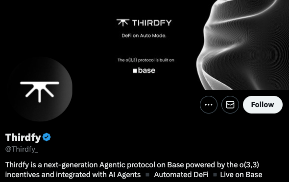 Thirdfy is an AI-driven DeFi protocol on Base that automates yield strategies and governance using agent-based decisioning, led by an AI CEO. It simplifies ve(3,3)-style tokenomics through automated participation and gasless interactions for users.